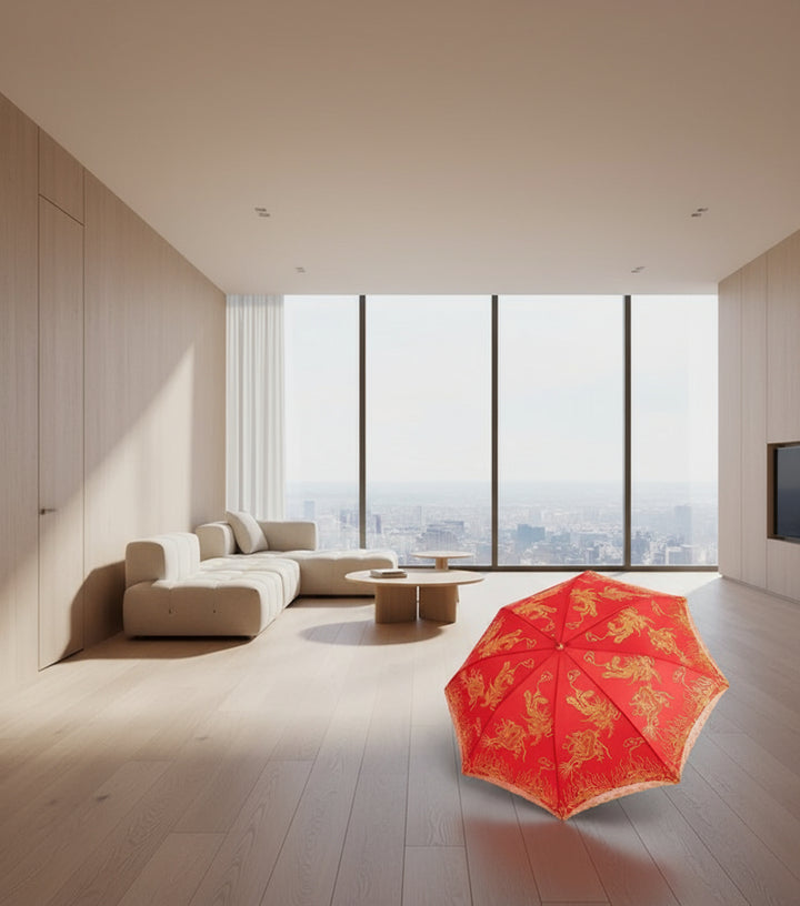 金線紅傘以大紅為底,織入細緻金線,寓意富貴吉祥。傘面緊密防潑水,開合順暢;握柄手感穩妥,拍照、出門迎親體面亮眼。可作新娘擋煞、遮喜儀式之用,傳統與質感兼備。